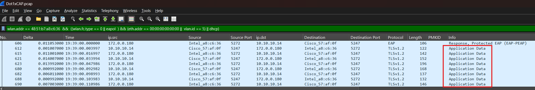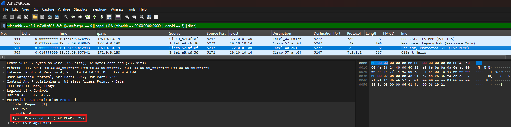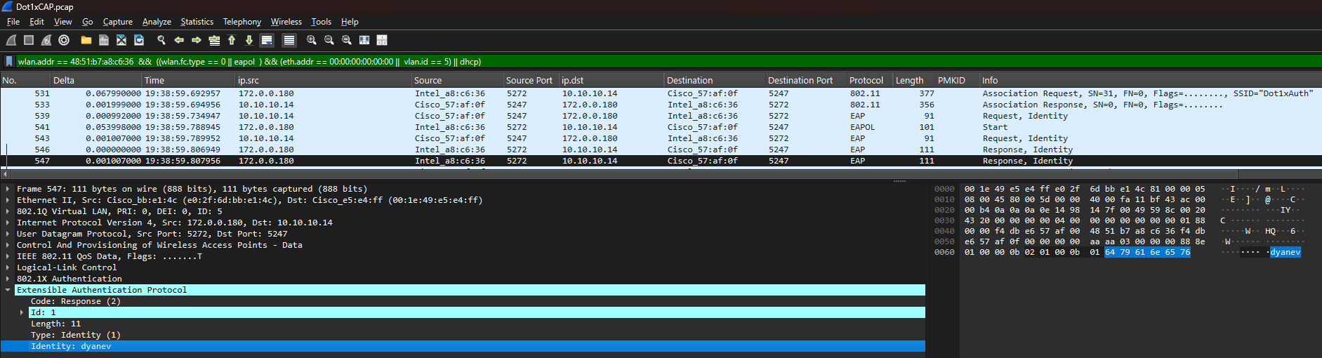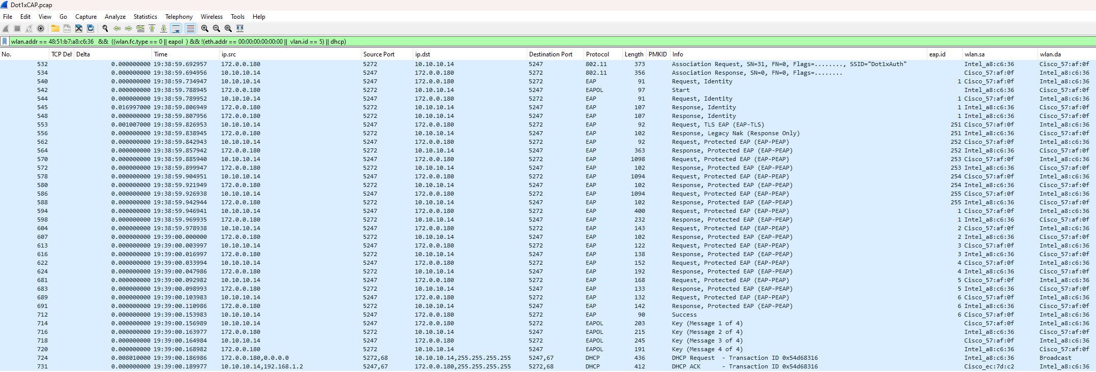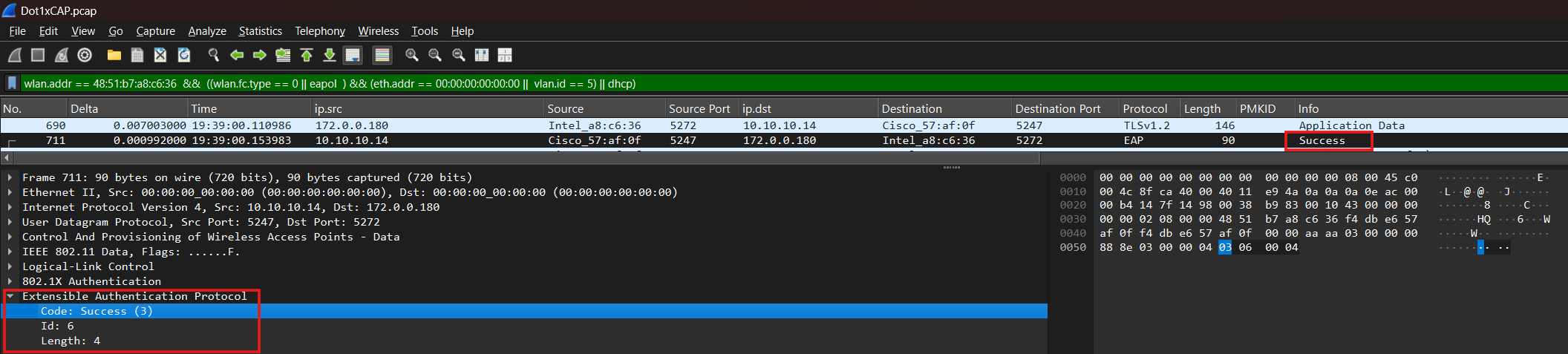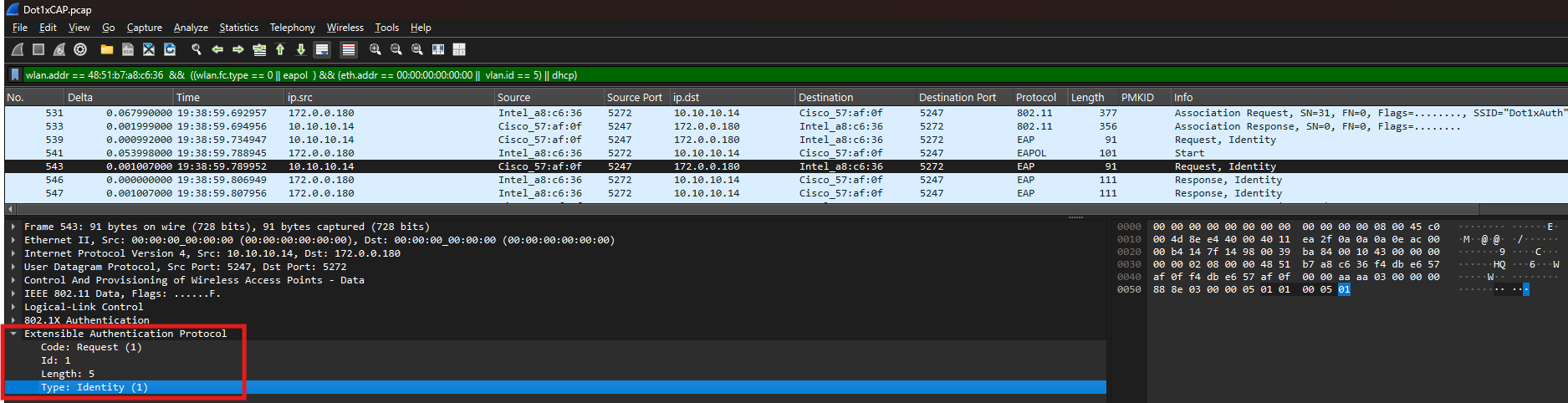 Note: While interface-level traffic remains in clear text, Wireshark often truncates this data. For deep-dive analysis of EAP payload details, stick to the CPU/Control-plane view to ensure you see the full, non-truncated frame.