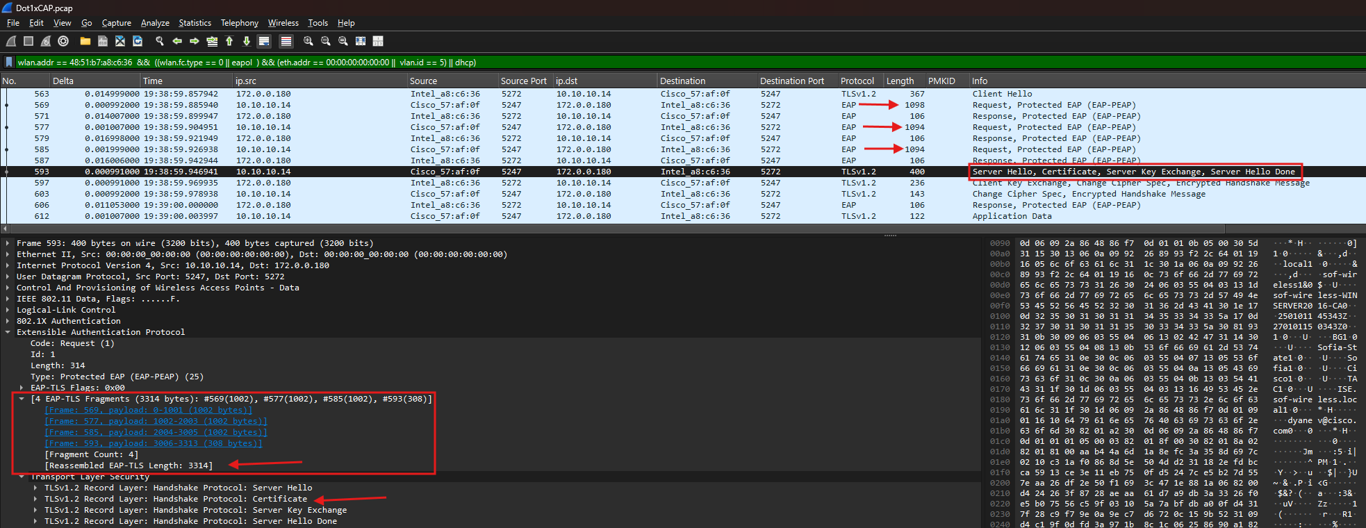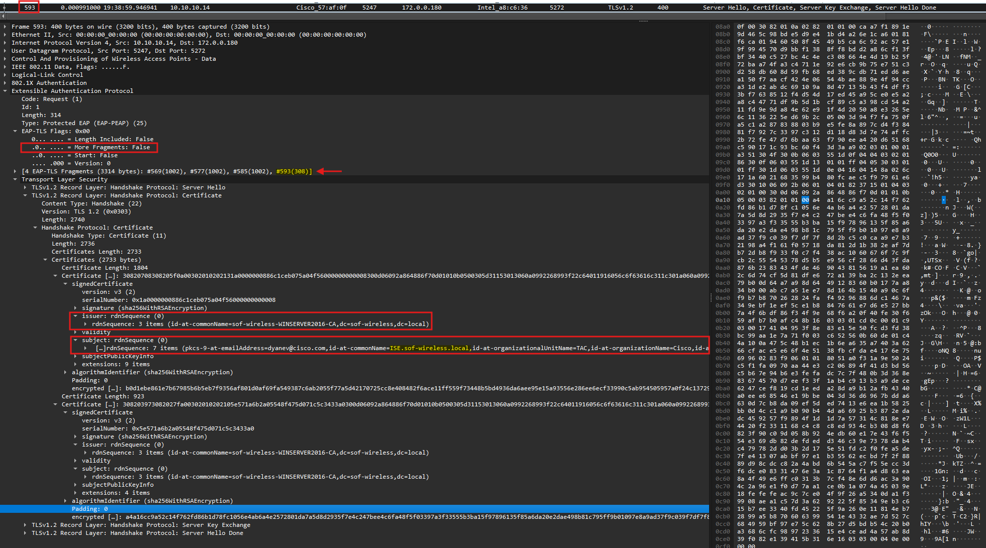 Jan 1 17:38:59 AP3802I-E-K9 kernel: [*01/01/2025 17:38:59.5627] chatter: eap_to_cli: 1030 | 4851b7a8 c636f4db e657af0f 888e0300 03f401fd 03f419c0 00000cf2 16030300 59020000 55030388 62d688ad 3e44e62c de53761e 8dc06701 d6c0e767 22e5c81f 13abc437 7c0d9920 a3cfc988 241abe23 4aa1a814 c7cff3ee 8f43b371 f6bdd765 44048d19 # The next large data packet originates from the wired/AAA/Radius side, indicating a piece of the Server Certificate Chain sent to the client.