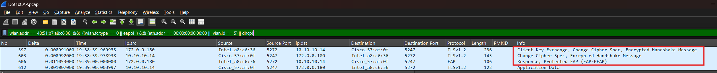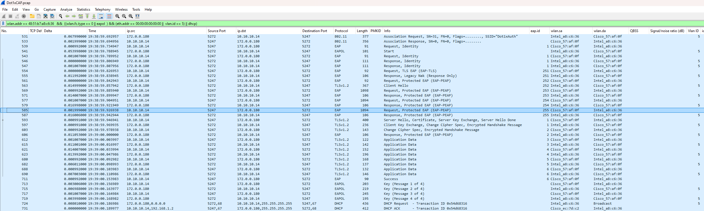 wlan.addr == <client-mac> && ((wlan.fc.type == 0 || eapol) && (eth.addr == 00:00:00:00:00:00 || vlan.id == <WMI>) || dhcp)> Use this to filter out encrypted data and focus purely on the management and EAP frames.