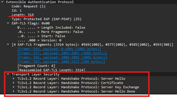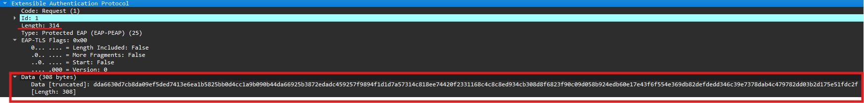 Jan 1 17:38:59 AP3802I-E-K9 kernel: [*01/01/2025 17:38:59.5234] chatter: eap_from_cli: 285 | f4dbe657 af0f4851 b7a8c636 888e0100 010b02fc 010b1980 00000101 16030100 fc010000 f8030374 1c8e7573 d97ca922 c412f110 5a50636d 28d5fa45 24de1dc3 ffbdb888 14384e20 e6e08940 67cd4e3f 35f7b8c1 60c80a82 7c0e4330 86b8be71 df83e012 # Based on packet size alone, without checking the EAP ID, it is identified as a "Client Hello" packet.